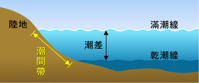 當海水漲潮至極大值,我們稱之為滿潮;同樣地,當海水退潮退至最低點,稱之為乾潮。滿潮與乾潮之間的水位差,我們稱之為潮差,其對應到的海岸線,我們稱之為潮間帶。潮間帶因為位處生態交會區,所以各種環境因子的變化非常劇烈,足以影響到生物生存的條件,但也因為如此,潮間帶具有非常多的生物,各自具有高度的適應力,在此地生生不息。