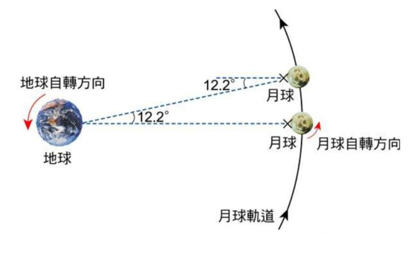 由於月球每天公轉約12度,所以當地球自轉一圈回到原地後,需再額外多轉12度,月亮才會再度出現於中天,而地球自轉12度約需花費50分鐘,因此每天漲潮(退潮)時間會延後50分鐘,潮汐週期約12小時25分鐘。