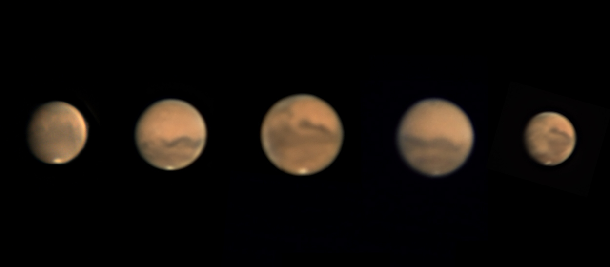 (火星,分別攝於2020/9/6、9/29、10/14、11/1、11/18,「衝」日為10/14,可看出當日火星的視直徑最大)
