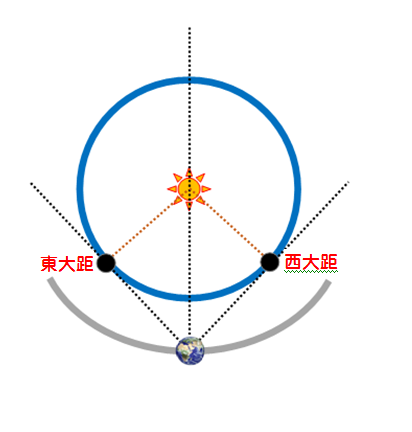 所謂「大距」是指內行星與太陽、地球相對位置成一直角三角形時,而該內行星位於直角處;此時從地球上觀測內行星恰位於「最大角距離」之時(如圖示),目視她們距離太陽的距離也是最遠。