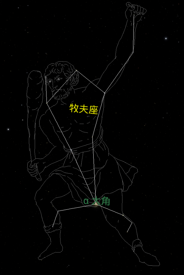 在春季及夏季的夜空中,順著北斗七星的斗柄曲線延伸過去,可以看到一顆火紅耀眼的紅巨星-大角。從大角星再往北方延伸,可以拉出一個冰淇淋的圓筒狀,又像一面長尾巴的風箏,這就是牧夫座。