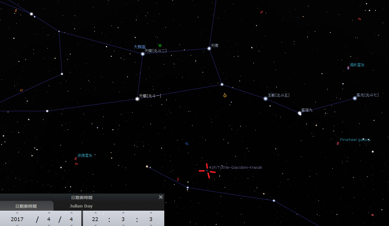 早在1858年就被發現的41P/Tuttle–Giacobini–Kresák 彗星,是一顆短周期的「木族彗星」。去年(2016)11月中又被Pan-STARRS巡天計畫觀測到的41P彗星,預計在2017年的4月初最接近地球,約莫2千萬公里左右。去年被觀測到的亮度只有21星等,隨著時間的推進,預估4月飛至大熊座,亮度可以達7星等,一般小型的雙筒望遠鏡可以觀察得到。
