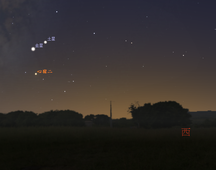 從地球上看天空,兩顆星球的赤經經度相同時,稱之為「合」,也是兩顆星球在地面上看起來很接近的時候,而在2016年10月30日則會出現土星合金星的天象。兩者相距約3度(伸直手臂伸出3隻手指的寬度),等到傍晚太陽西下後,在西方接近地平線的天空可以同時看見土星、金星及心宿二(如圖),此時土星亮度約為0.5等,金星亮度達到-4等,下班的時候不妨也欣賞一下這難得的景象吧。