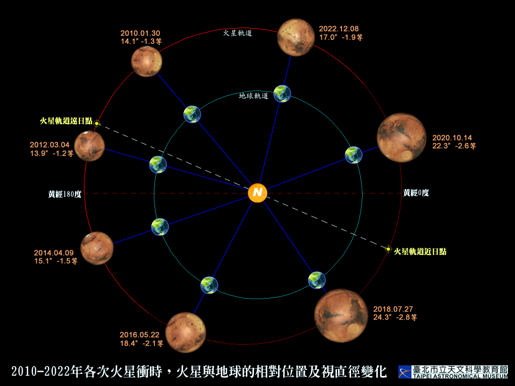 2016年5月22日這一天是火星衝,火星看起來會又紅又亮,在介紹火星衝之前,先來談談什麼是「衝」。太陽系內的行星,以地球為界,靠近太陽的兩顆行星,也就是水星和金星,稱為地內行星;地球軌道外側的行星,也就是火星、木星、土星、天王星和海王星,稱為地外行星。當某ㄧ顆地外行星、地球和太陽三個天體排成一直線時,天文上稱作「衝」,地外行星在衝的時候,它與地球的距離會最靠近。