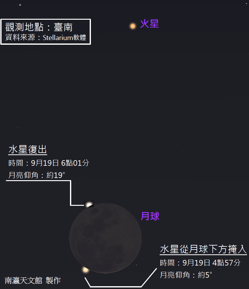 緊接著隔天9月19日清晨,火星和水星也來月亮旁邊湊熱鬧。這次水星不僅會靠近月球,還會跑到它的後方被擋住,稱為「月掩水星」,當天清晨一樣在東方地平線上,在台南約從4點57分開始水星會從眉月的左下方掩入,到6點1分才從月球上方復出(在台北約從5點整掩入、5點59分復出),此時月球仰角只有17度,觀測難度頗高。但月掩行星的機會非常難得,下次要等到2023年才有月掩金星的發生。