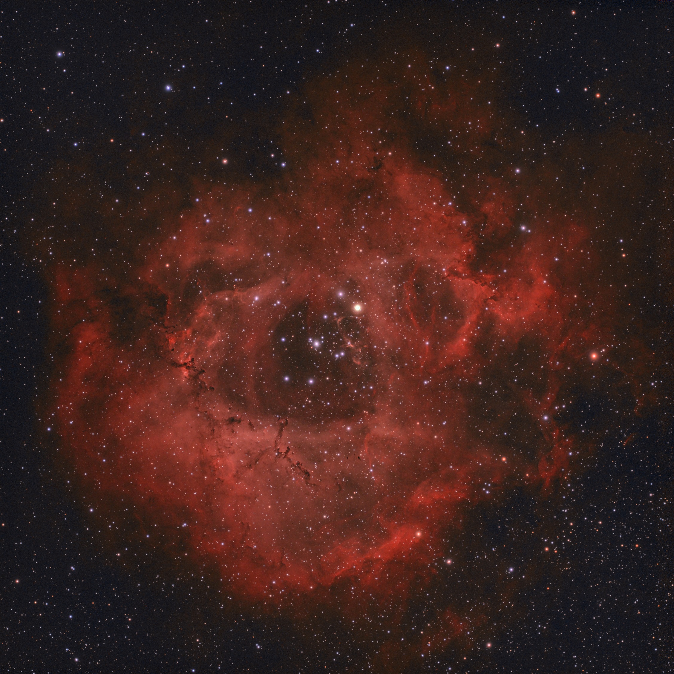 天空中也有玫瑰盛開! 位在冬季大三角─參宿四、天狼星、南河三的中間,麒麟座的頭部(雖然筆者從來不會認麒麟,好暗阿...),玫瑰星雲的中間有一個年輕的疏散星團(NGC2244),旁邊的「玫瑰」亮度不高且散布在較大的範圍內,經過長時間的曝光就可以捕捉到它。