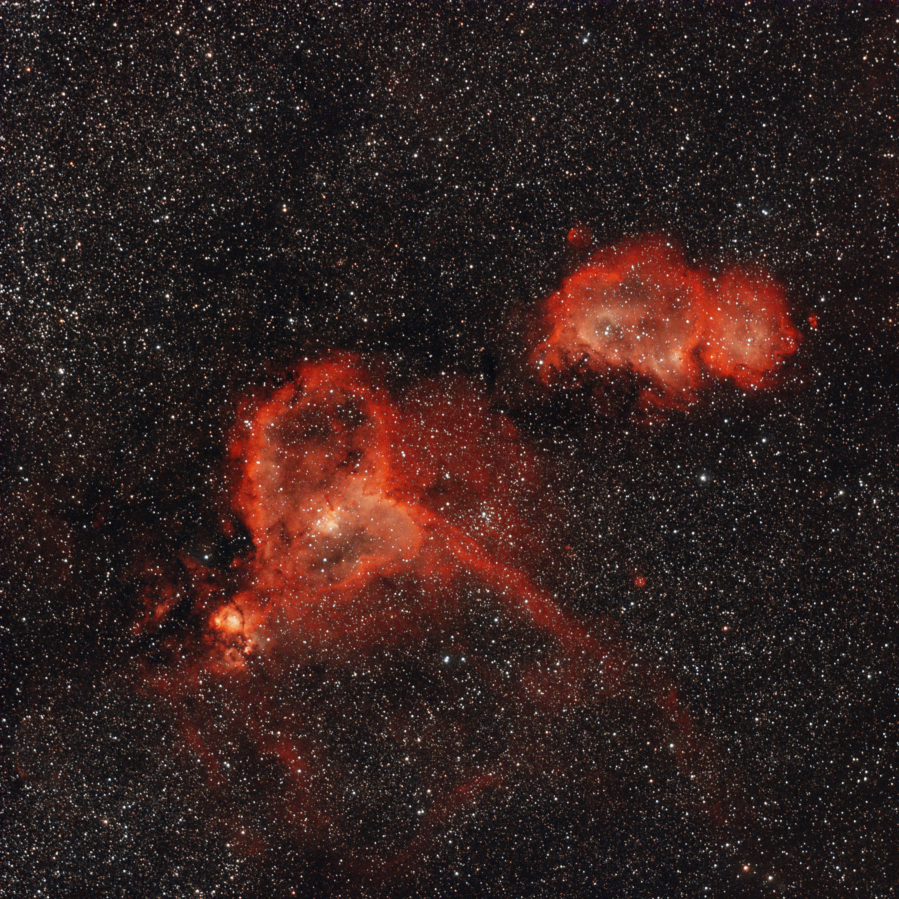 兩個大面積的星雲:心臟星雲、靈魂星雲,位在仙后座,充滿了美麗的紅色電離氫的發射譜線,平常在天文館的望遠鏡焦距較長無法完整拍下他們,這次用焦距100mm的相機鏡頭總算一次入鏡!