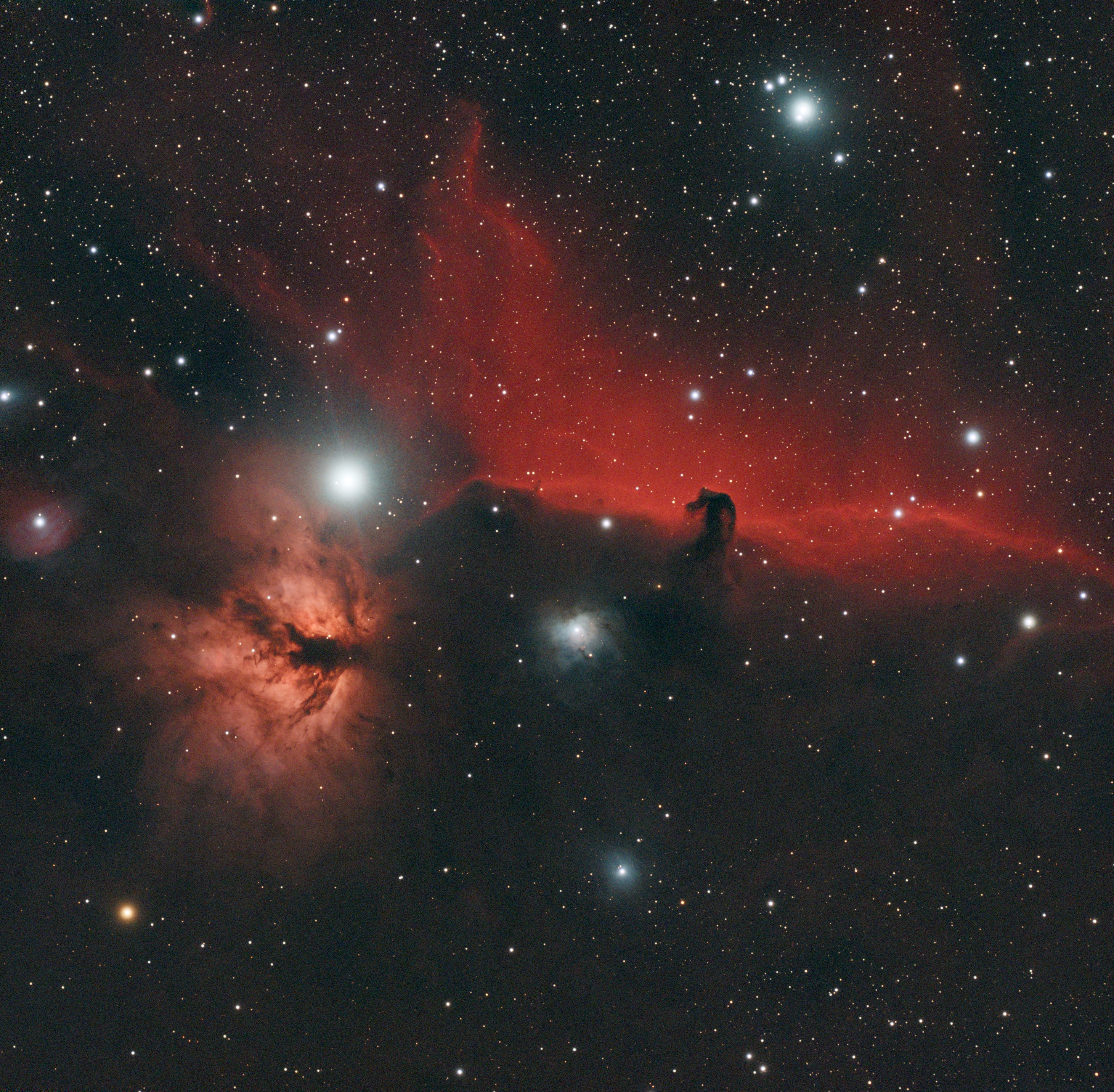 除了紅色的發射星雲以外,還有少許藍白色的反射星雲交錯其中,像是位於畫面正中的NGC2023、下方的IC435、左方的IC432...
