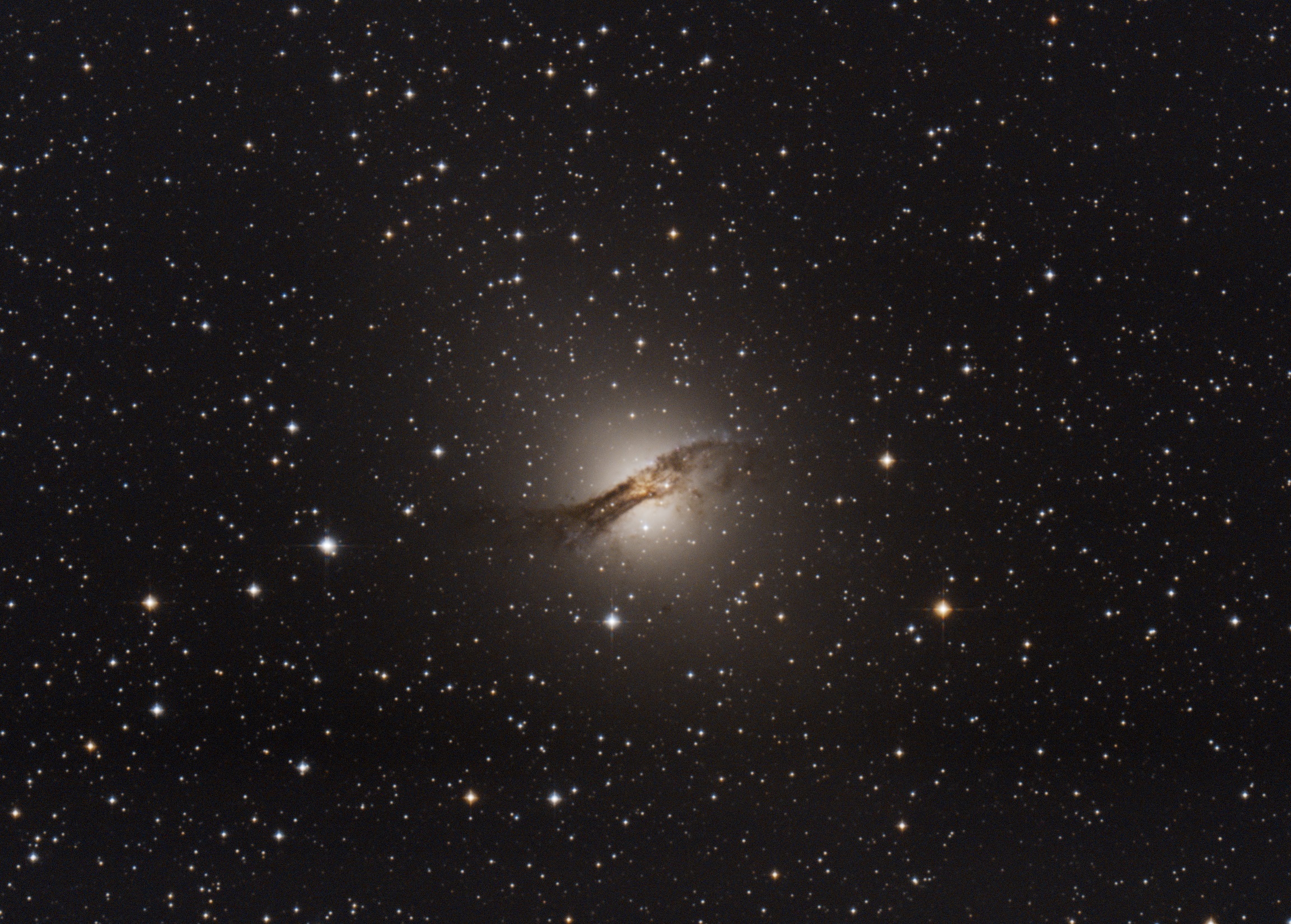 外觀上有一條明顯的黑色塵埃帶,背景則看起來像一個橢圓星系,推測是由橢圓星系與螺旋星系碰撞的結果,用X射線及無線電可觀測到星系核心所噴出的相對論性噴流(不過可見光看不到...)。