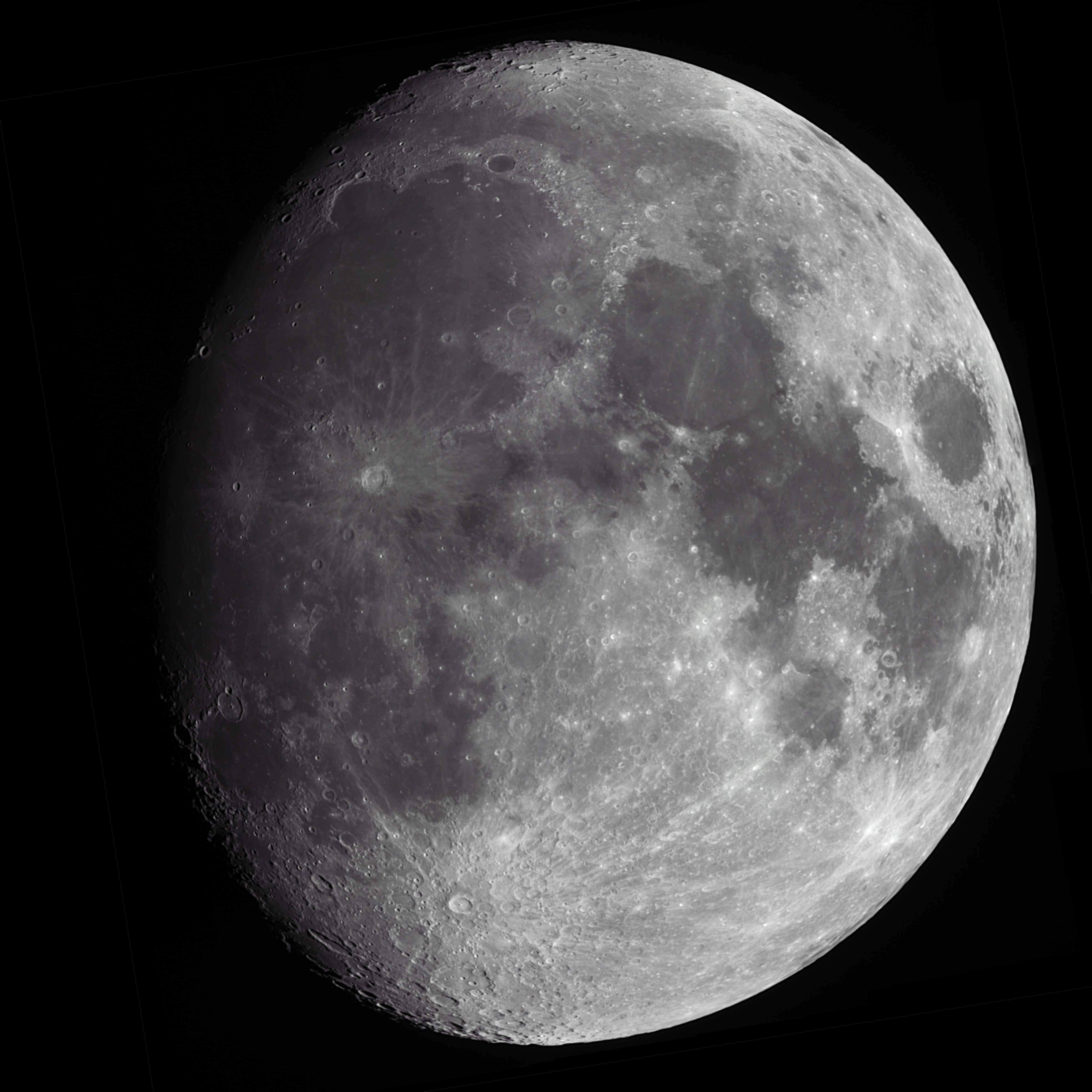 農曆十二號的盈凸月,可以輕易的看到「月兔」的形狀,不過月球上的兔子不是白的,而是黑色的區塊(月海)看起來像兔子。試著尋找本圖右側兔子的兩個長長的耳朵(往下伸),往上兔頭的部分則是寧靜海─阿姆斯壯登月的著陸地點就在這,其實就算不使用望遠鏡,以肉眼也能依稀看出這些特徵,推薦大家有機會自己來找找看!