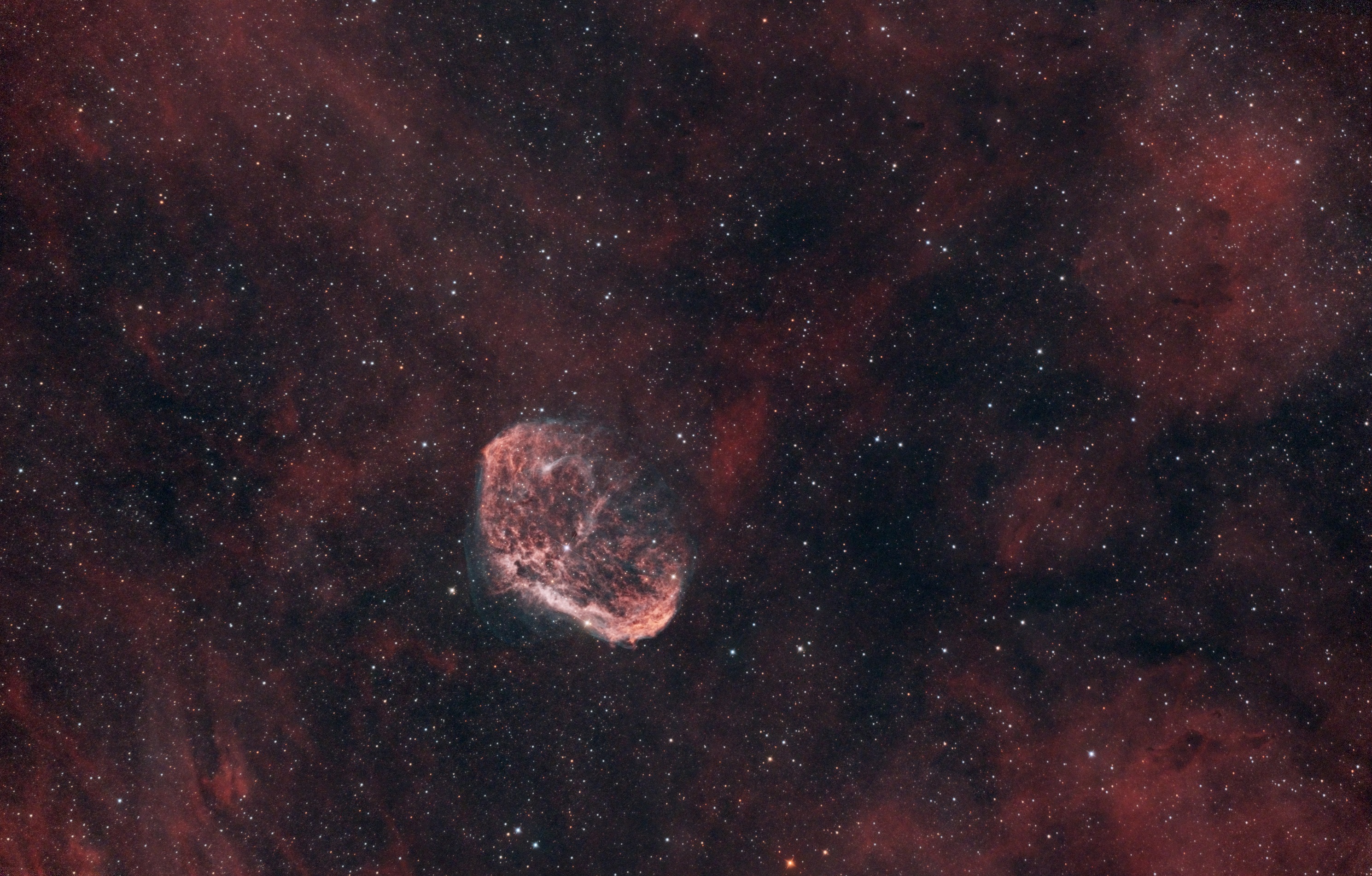 眉月星雲位於天鵝座的身體「天津一」附近(可以在之前拍過的廣域天鵝座周邊看到它),是由演化至末期的沃爾夫-拉葉(Wolf–Rayet)星HD192163所吹出的快速恆星風,與周圍的物質碰撞形成殼狀的結構。