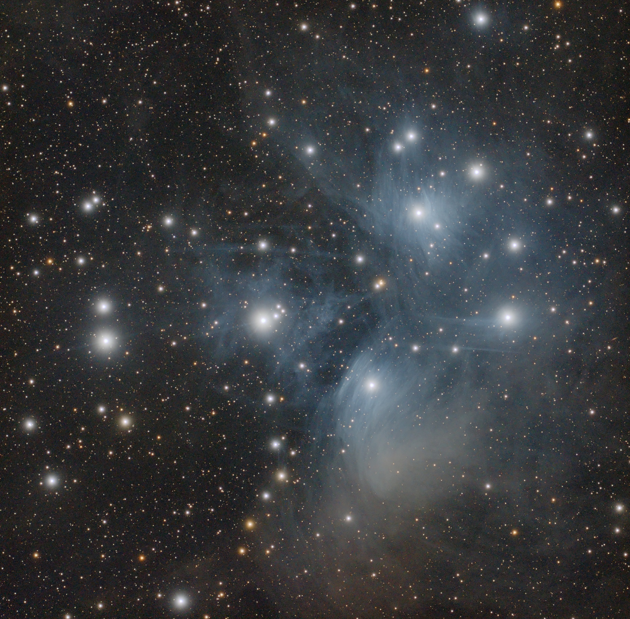 冬天非常容易欣賞的深空天體,雖然目視只能看到星團中的恆星,但是恆星所發出的光芒照亮周圍的物質,產生黯淡的藍白色反射星雲。