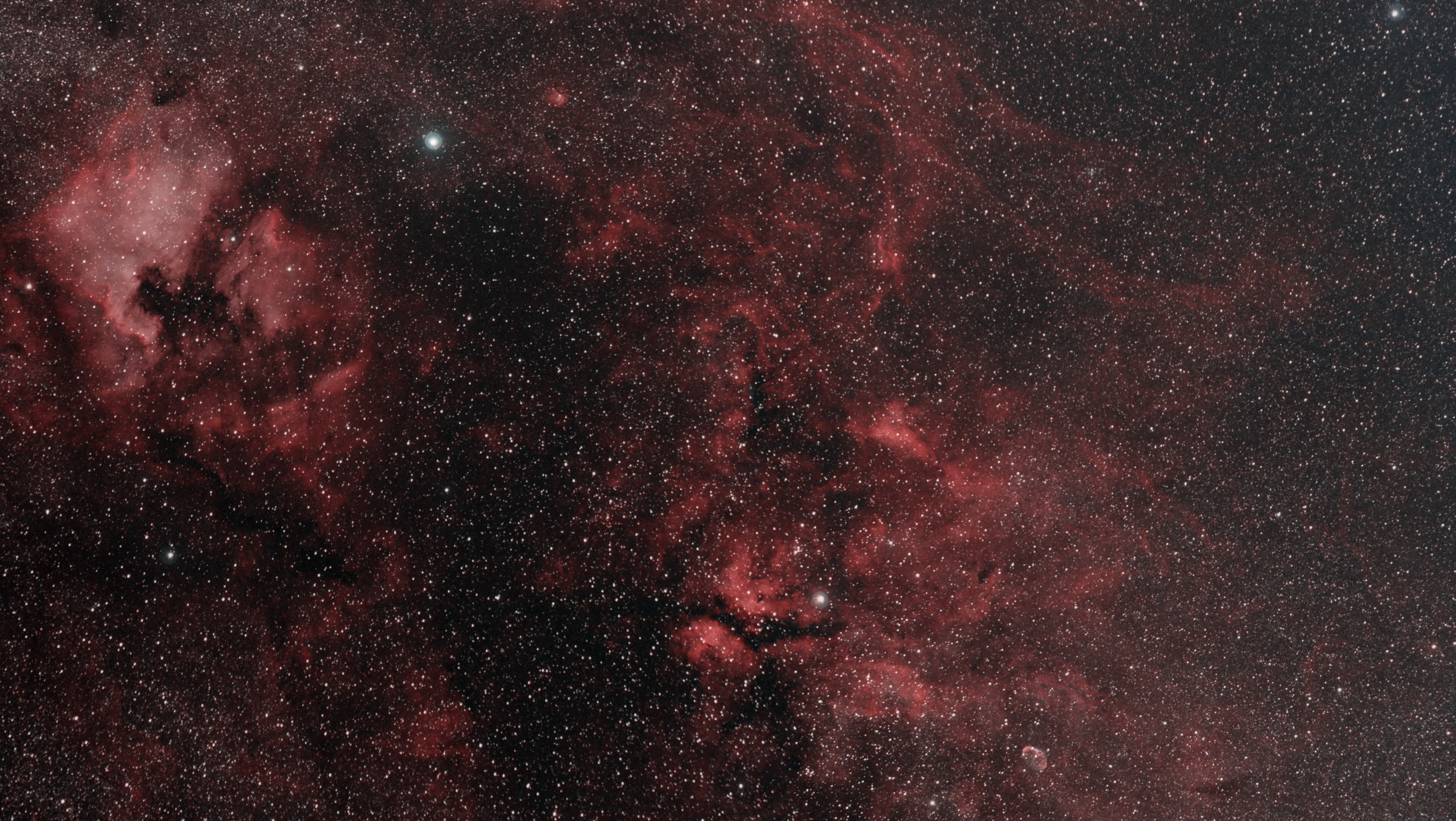 在銀河的盤面上,許多地方有著豐富的雲氣,天鵝座的屁股「天津四」周圍就是這樣的地方,利用窄頻的濾鏡加上長時間曝光即可看到這片天空充滿電離氫所發出的H-α紅色雲氣,非常壯觀!