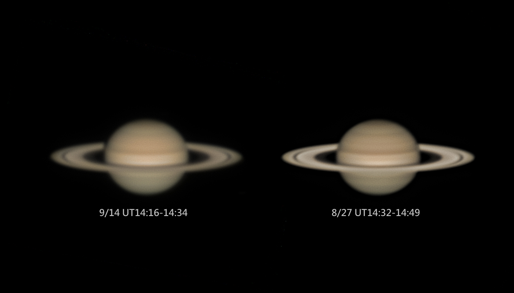 土星環是由許多小顆粒所組成的,這些顆粒彼此之間也會產生陰影互相遮擋,當土星恰好位於「衝」時,陽光100%正面照向土星環,這時從地球來看,完全不會看到顆粒的影子,亮度就急劇上升~這個現象只會發生於衝日的前後數天以內,今年剛好有在8/27衝的當天拍到土星,相隔2周多就可以明顯看到土星環的亮度差異。