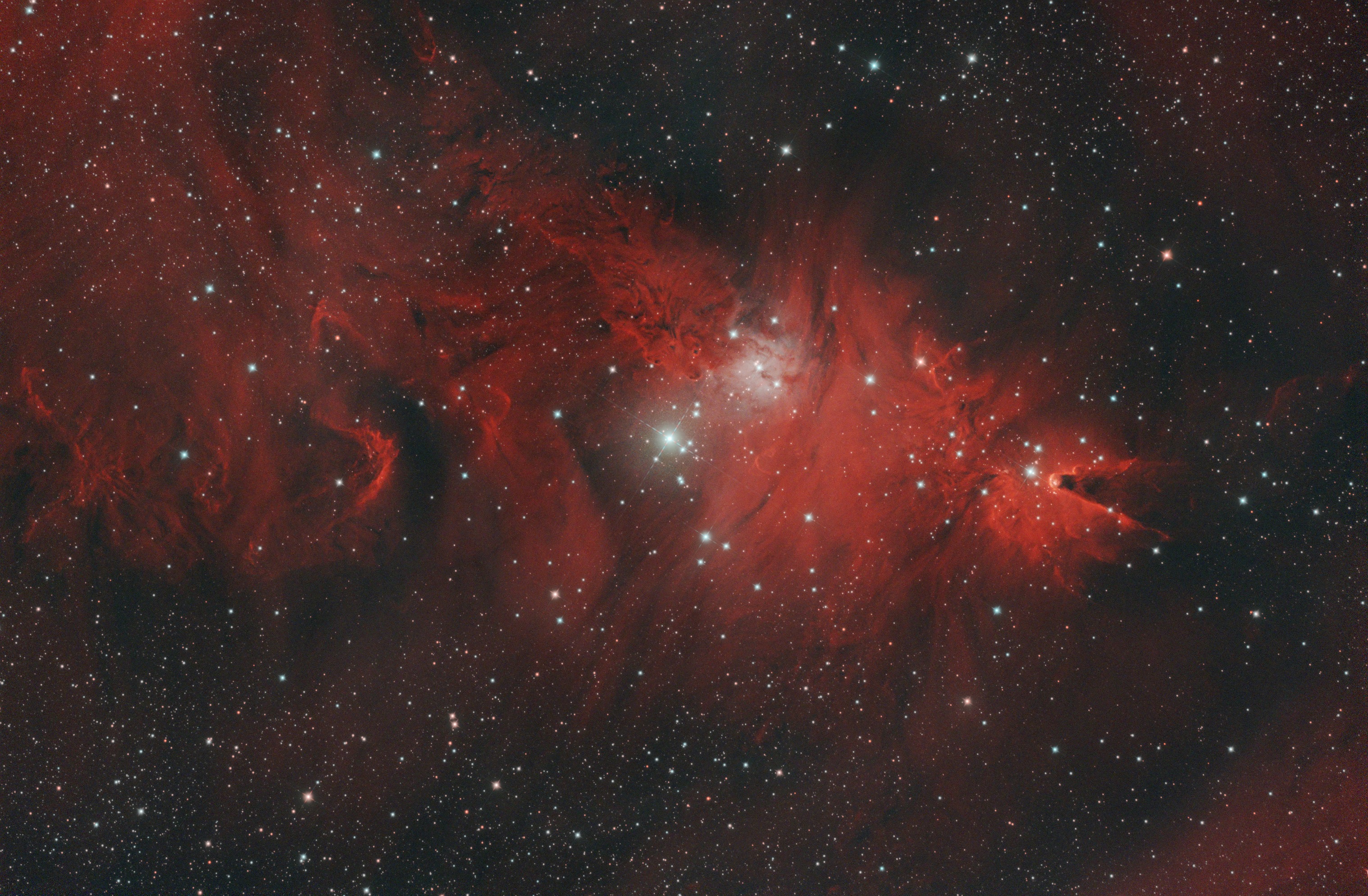 位在麒麟座,玫瑰星雲的附近(後來看星圖才發現真的好近,大約只差不到5°而已),是一個滿具特色、很好聯想的星雲─照片右方的圓錐狀雲氣以及頂端的亮星,就是大家最熟悉的聖誕樹的模樣。(這張聖誕樹的角度是側倒著的)