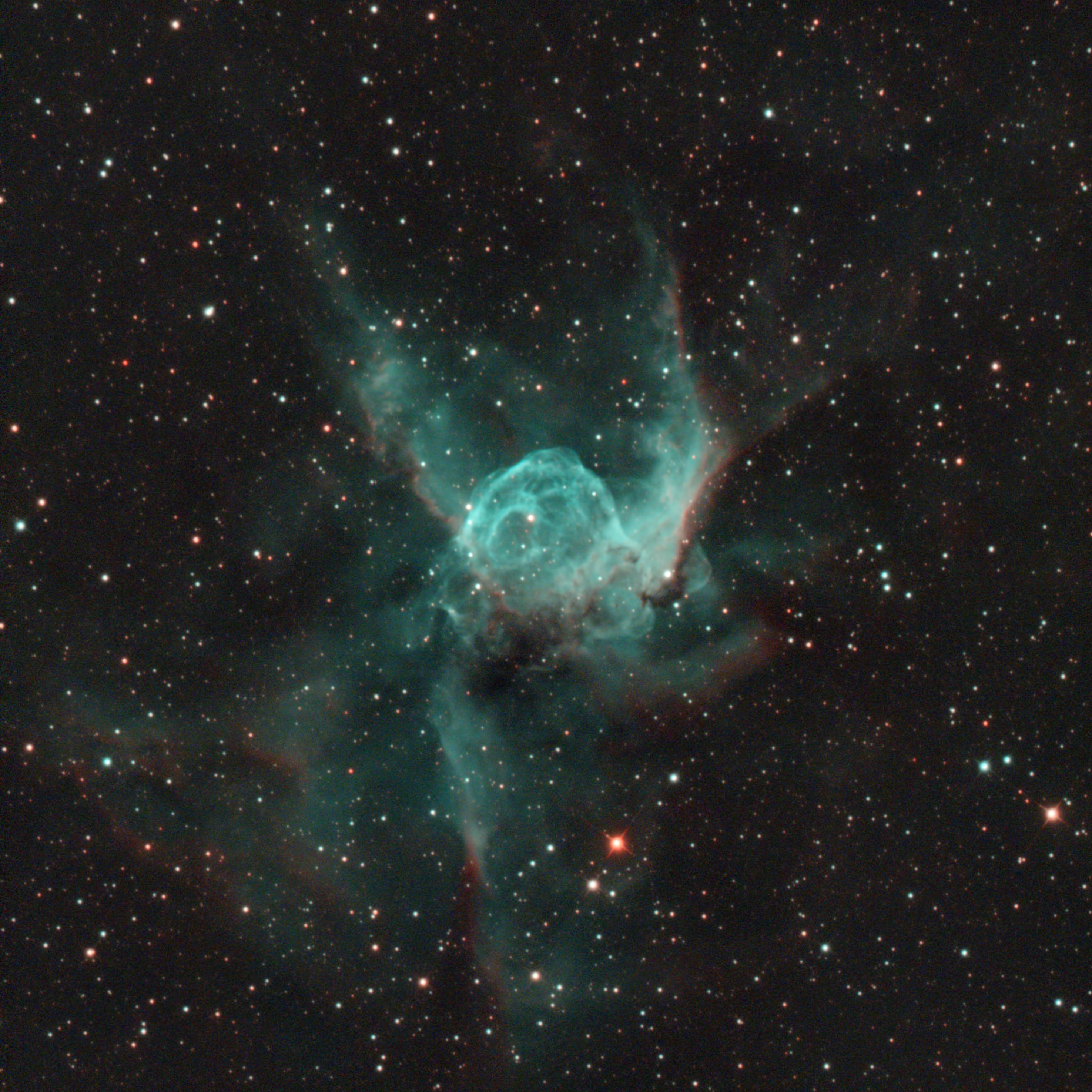 NGC2359位於大犬座,由中心瀕臨死亡的大質量恆星吹出強烈的恆星風,與周圍的星際物質交互作用形成複雜的形狀,美麗的藍綠色來自OIII譜線,中心氣泡狀形似頭盔而得名。